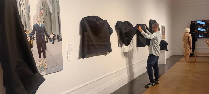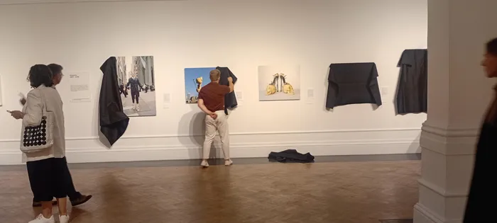 Audience member views Steven Cohen's censored work at Iziko South African National Gallery (ISANG).