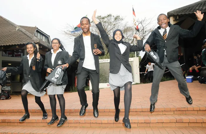 Mountview Secondary School pupils (team two) celebrate their success in zone three of the Daily News National High School Quiz with IIE’s Varsity College held at Crawford College North Coast. From left: Kimika Ramdar, Diniel Naidoo, Simphiwe Makhenke, Bibi-Ayesha Asmal and Nduduzo Blose. Picture: Sibonelo Ngcobo/African News Agency (ANA) Mountview Secondary School pupils (team two) celebrate their success in zone three of the Daily News National High School Quiz with IIE’s Varsity College held at Crawford College North Coast. From left: Kimika Ramdar, Diniel Naidoo, Simphiwe Makhenke, Bibi-Ayesha Asmal and Nduduzo Blose. Picture: Sibonelo Ngcobo/African News Agency (ANA)