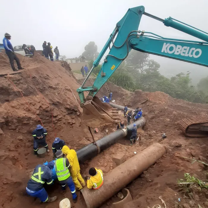 eThekwini Municipality workers repair a burst pipe with fragments at the Mount Moriah Reservoir. l SUPPLIED