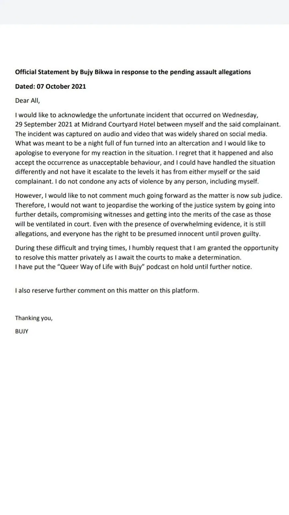 The statement reads: โI would like to acknowledge the unfortunate incident that occurred on Wednesday, 29 September 2021 at Midrand Courtyard Hotel between myself and the said complainant.