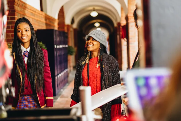 Lead actress Ama Qamata and director Nosipho Dumisa have a chat while shooting scenes for the Netflix series ’Blood & Water’. Picture: Netflix