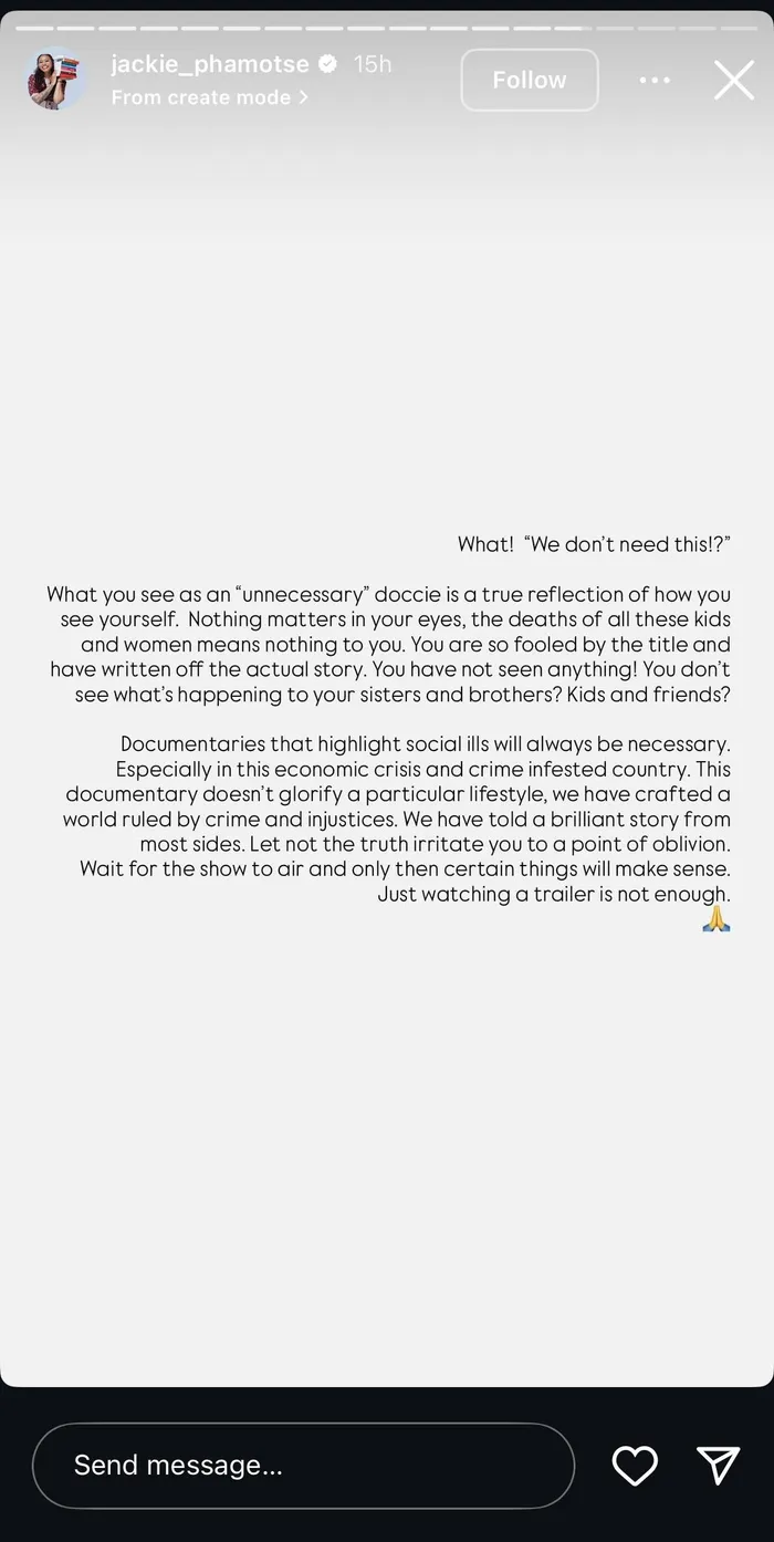 Phamotse taking to her Instagram stories hit back at the comments that are not in favour of the series.
