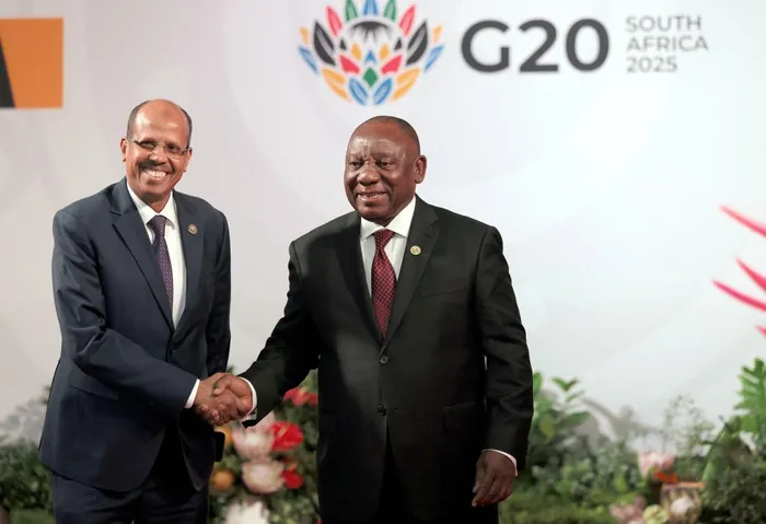 South African President Cyril Ramaphosa (R) welcomes H.E. Mahmoud Ali Youssouf, head of the African Union, as he arrives for the opening of the G20 Leaders' Summit at the Nasrec Expo Centre in Johannesburg on November 22, 2025.