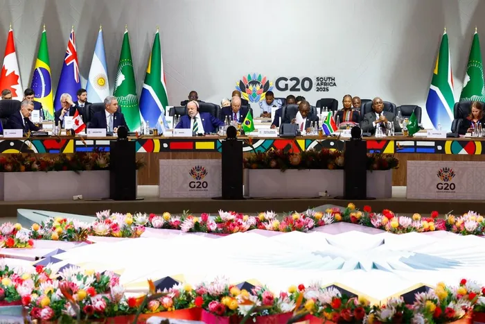 A general view shows heads of state during a G20 Leaders' Summit plenary session at the Nasrec Expo Centre in Johannesburg on November 22, 2025.