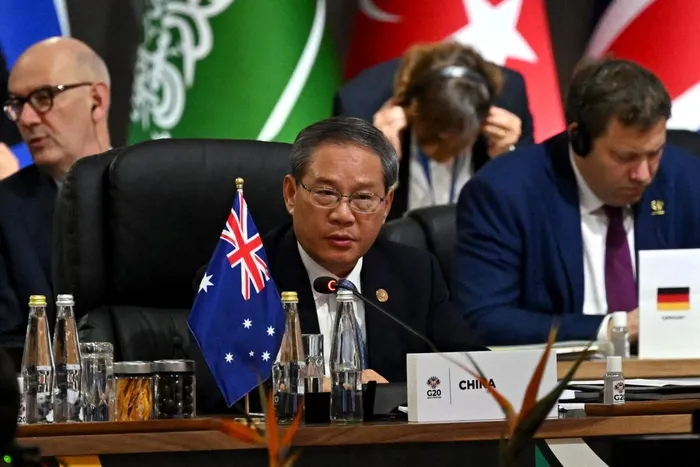 China's Prime Minister Li Qiang (C) attends a G20 Leaders' Summit plenary session at the Nasrec Expo Centre in Johannesburg on November 22, 2025.