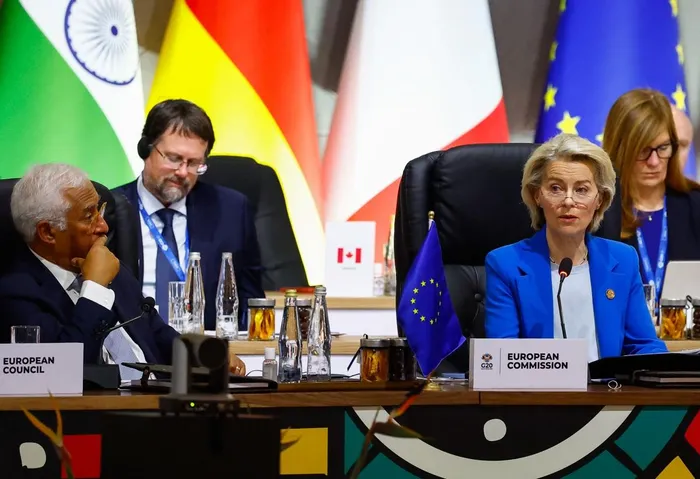 European Commission President Ursula von der Leyen (front R) and President of the European Council Antonio Costa (L) attend a G20 Leaders' Summit plenary session at the Nasrec Expo Centre in Johannesburg on November 22, 2025.