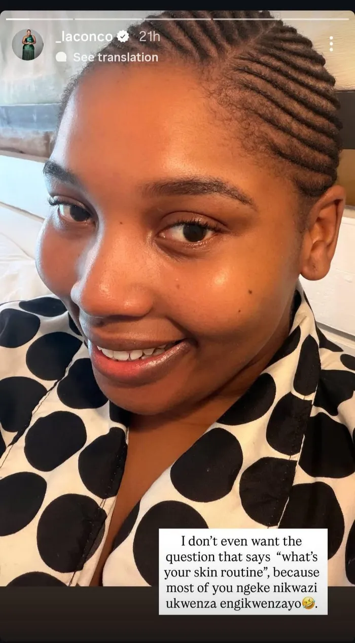 In a selfie posted to her Instagram Stories, she wrote: “I don’t even want the question that says, ‘what’s your skin routine?’ because most of you ngeke nikwazi ukwenza engikwenzayo (You will never be able to do what I do).”