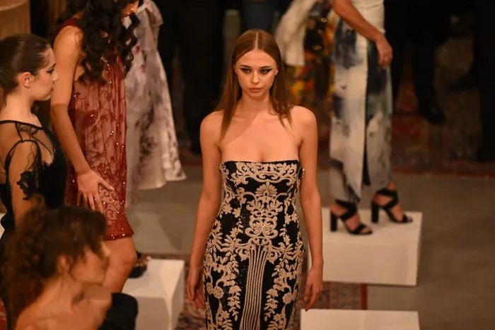 A model walks the catwalks during a fashion show where creations by South African designers, including Simply Mooi, Moira Hurungo, House of Lefane, Malusi Malefane, Aelahn, Feroza Webster, Ruff Tung, Jacques LaGrange, Cathy, Kluk/CGDT, and Helon Melon, were presented during the CTIJF prelude fashion show at Youngblood-Africa Gallery in Cape Town.