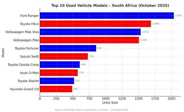 They continue to dominate the leaderboard, with 40% of the top 10 models wearing a Toyota badge. Volkswagen holds second place with 5 209 used vehicles sold, while Ford maintains third position with 3 641 sales.