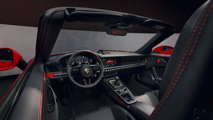 Unlike regular 911 convertibles, the GT3 S/C is a two-seater, with occupants sinking into Porsche’s Sports Seats Plus, upholstered in black leather. Carbon-fibre bucket seats are available as an option for those seeking to save even more kilograms.