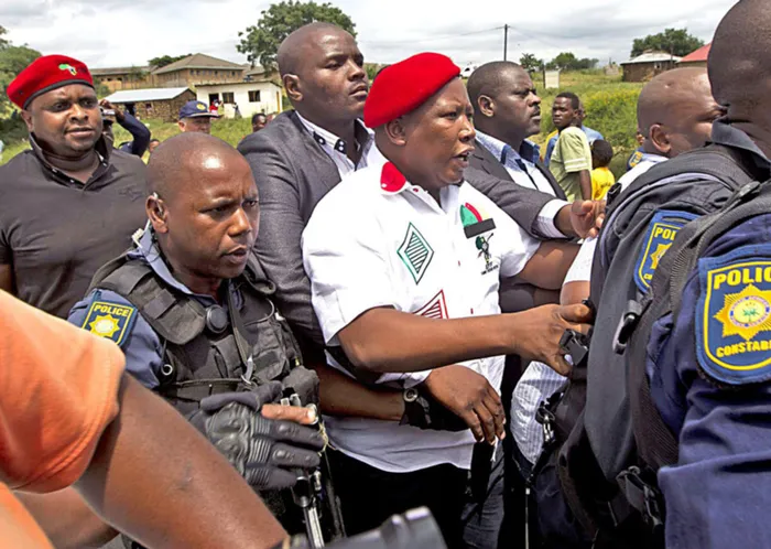 EFF leader Julius Malema is escorted by cops after his car was blocked by supporters of the ANC near the homestead of President Zuma in Nkandla. Photo: Rogan Ward EFF leader Julius Malema is escorted by cops after his car was blocked by supporters of the ANC near the homestead of President Zuma in Nkandla. Photo: Rogan Ward