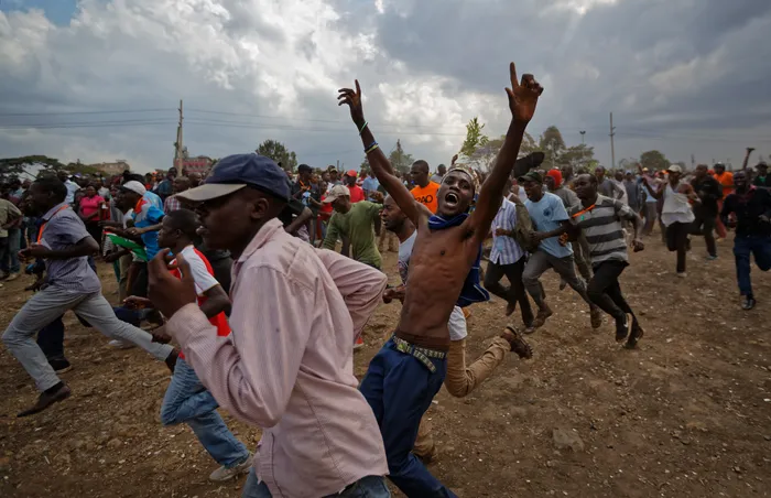 Supporters of Kenyan opposition leader Raila Odinga run through the crowd prior to his arrival at a mass rally in the Shauri Moyo area of Nairobi, Kenya. Picture: AP Photo/Ben Curtis Supporters of Kenyan opposition leader Raila Odinga run through the crowd prior to his arrival at a mass rally in the Shauri Moyo area of Nairobi, Kenya. Picture: AP Photo/Ben Curtis