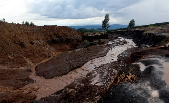 A general view shows water flowing from the dam that burst its walls, overrunning nearby homes, in Solai town near Nakuru, Kenya. Picture: Reuters/Thomas Mukoya A general view shows water flowing from the dam that burst its walls, overrunning nearby homes, in Solai town near Nakuru, Kenya. Picture: Reuters/Thomas Mukoya