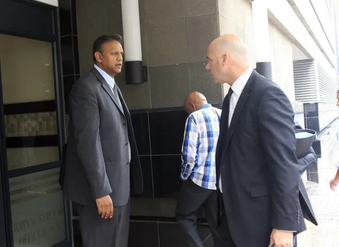 Vimal Rajbansi talks to his lawyer, advocate Paul Jorgensen, outside the Durban Commercial Crime Court. Picture: SIBUSISO NDLOVU