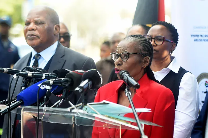 Retired judge Justice Sisi Khampepe, chair of the Judicial Commission of Inquiry into apartheid-era crimes, speaking during a press conference.