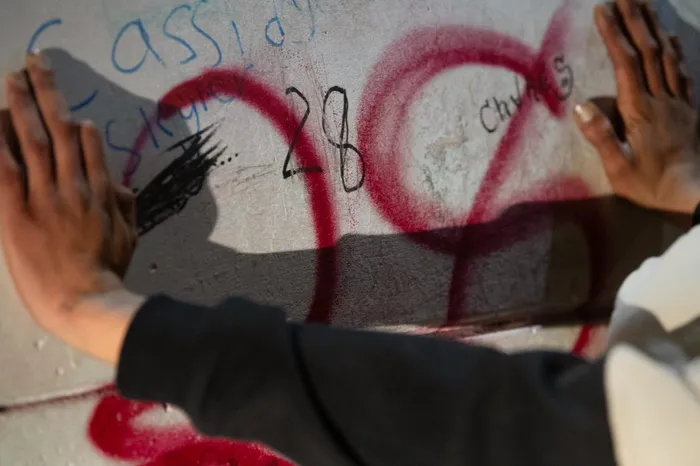 A man puts his hands against a wall, with '28' (referring to a gang) written on it as he is searched during a combined visible policing and stop-and-search operation in Lavender Hill near Cape Town on August 28, 2025.