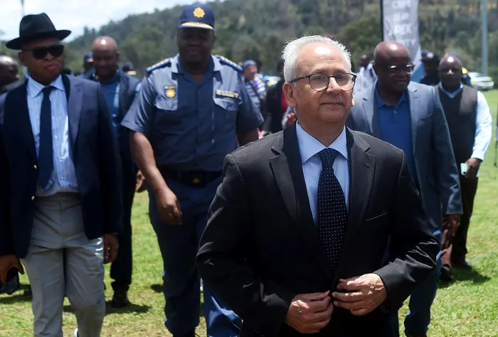 Acting Police Minister Professor Firoz Cachalia inspects the police parade at the FNB Park and Ride Space in Johannesburg during the JCPS Cluster’s G20 readiness briefing.