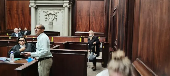 Murder accused Zurenah Smit enters the Western Cape High Court with a crutch on Thursday, shortly before retching could be heard from the dock. This followed her discharge from Victoria Hospital, where doctors had declared her medically fit to stand trial, contradicting a subsequent sick note claiming hypertension.