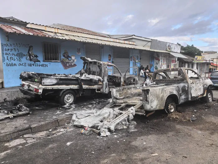 Damage left by protesters, which includes torched and stoned vehicles, as well as ransacked businesses owned by foreign nationals in KuGompo City this afternoon.