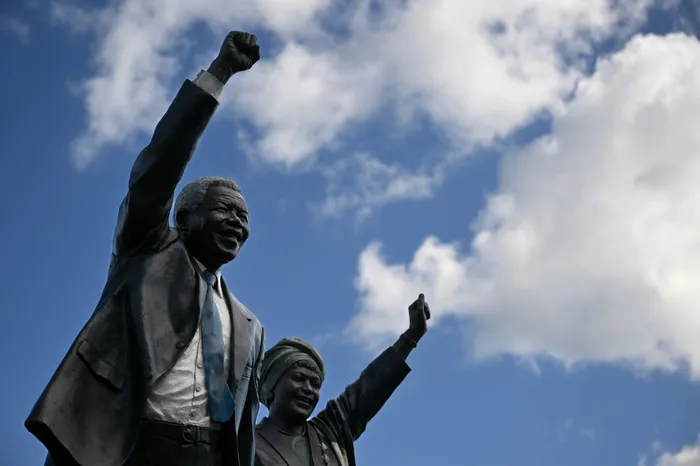 Nelson and Winnie Mandela statues at the "The Long March to Freedom" exhibition of life size statues at Century City's Canal Walk as the nation observes Freedom Day. The installation features 100 figures representing South African liberation heroes and the 350-year struggle against colonialism and apartheid, highlighting the sacrifices that led to the country's first democratic elections 32 years ago.