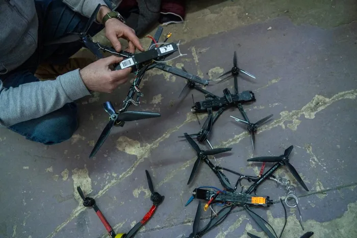 A self-defence unit volunteer shows intercepted Ukrainian FPV drones in Belgorod, the main city of Russia's western Belgorod region bordering Ukraine, on March 12, 2026, amid the ongoing Russian-Ukrainian conflict.