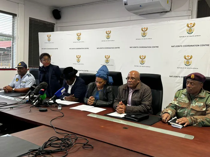 National Police Commissioner Fannie Masemola, Presidency Minister Khumbuzo Ntshaveni, Police Minister Bheki Cele, Defence Minister Thandi Modise, Home Affairs Minister Aaron Motsoaledi at the Natjoints briefing. Picture: Sihle Mlambo/IOL National Police Commissioner Fannie Masemola, Presidency Minister Khumbuzo Ntshaveni, Police Minister Bheki Cele, Defence Minister Thandi Modise, Home Affairs Minister Aaron Motsoaledi at the Natjoints briefing. Picture: Sihle Mlambo/IOL