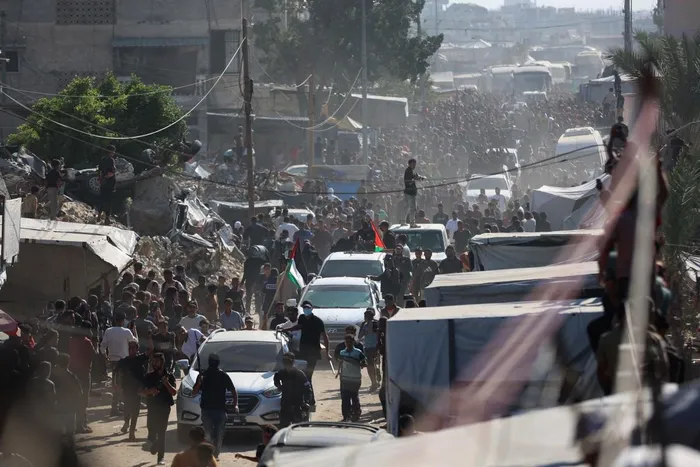 Buses carrying Palestinians released from Israeli prisons under a Gaza ceasefire and hostage exchange deal with Palestinian factions, arrive outside the Nasser hospital in Khan Yunis in the southern Gaza Strip.