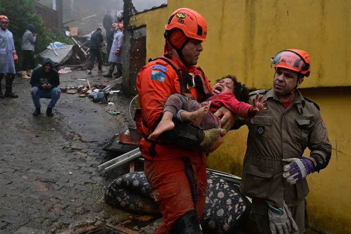 Members of the Civil Defense carry a girl, who remained more than 12 hours under the rubble of her house, which was destroyed by the heavy rains in Petropolis, Brazil on March 23, 2024. Picture: AFP
