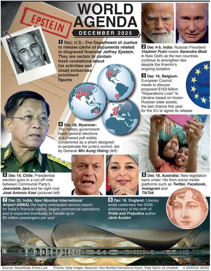 December’s events include the release of the Jeffrey Epstein files, the meeting between Putin and Modi, the European Council summit in Brussels, and the elections in Myanmar and Chile. Australia bans under-16s from social media, Navi Mumbai International Airport (NMIA) begins commercial operations, and the literary world celebrates the 250th anniversary of Jane Austen.