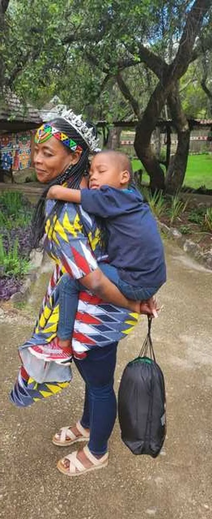 Ontlametse Phalatse, 6, on the back of Ontlametse Phalatse Primary School principal Emma Mothomogolo. Picture: Supplied