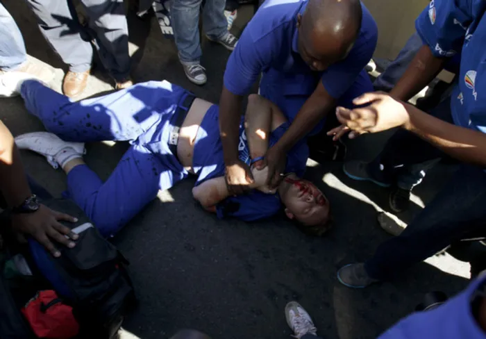 Paramedics attend to an injured DA supporter in Joburg on Tuesday. A march by the main opposition party on the headquarters of union federation Cosatu descended into chaos, with police firing tear gas to disperse crowds of rock-throwing protesters. Picture: Reuters Paramedics attend to an injured DA supporter in Joburg on Tuesday. A march by the main opposition party on the headquarters of union federation Cosatu descended into chaos, with police firing tear gas to disperse crowds of rock-throwing protesters. Picture: Reuters