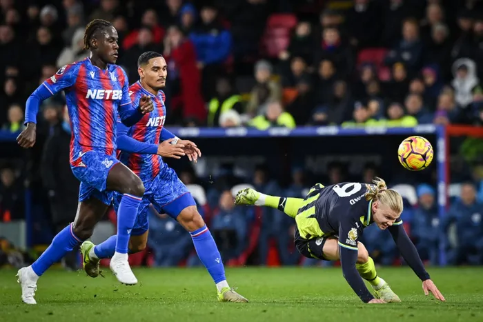 Manchester City's Norwegian striker #09 Erling Haaland fights for the ball with Crystal Palace's Sierra Leonean-born English defender Trevoh Chalobah and Crystal Palace's French defender Maxence Lacroix during the English Premier League football match between Crystal Palace and Manchester City at Selhurst Park in south London on December 7, 2024.