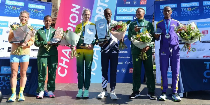 Gerda Steyn (third from left) raced to her second record victory in successive years and her fourth successive Totalsports Two Ocean Ultra Marathon win. Second place was claimed by Ethiopian Amelework Fikadu Bosho and third place by Carla Molinaro. In the men’s race, Zimbabwean born Givemore Mudzinganyama (third from right) took first place, followed by Dan Matshailwe and Nkosikhona Mahlakwana in third place. Picture: Phando Jikelo / African News Agency ( ANA)