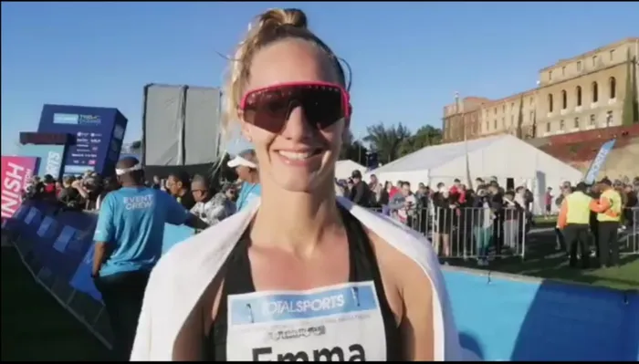 Emma Pallant from Great Britain moved from sixth place in 2022 to being the women’s Totalsports Town Oceans Half Marathon winner on Sunday. Picture: Okuhle Hlati