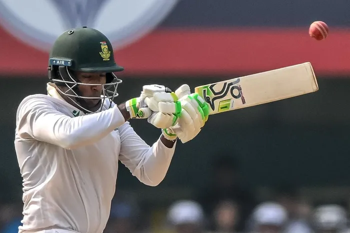 Senuran Muthusamy celebrated his maiden Test century against India in Guwahati on Sunday, cementing his status as a true all-rounder for the Proteas. Photo: AFP