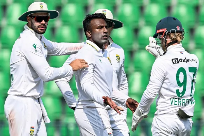 Senuran Muthusamy’s (centre) exceptional performances, including a crucial 89 not out and Player of the Series award in the Pakistan Test series, highlight his value as a batting allrounder, yet his place in the Proteas Test team remains uncertain due to South Africa’s fast bowling dominance and competition from other allrounders. Picture: Aamir Qureshi/AFP