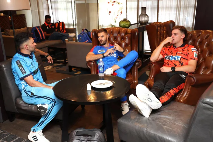 New Sunrisers Eastern Cape captain Tristan Stubbs (right) taking in some sage advice from senior leaders Aiden Markram and Keshav Maharaj.