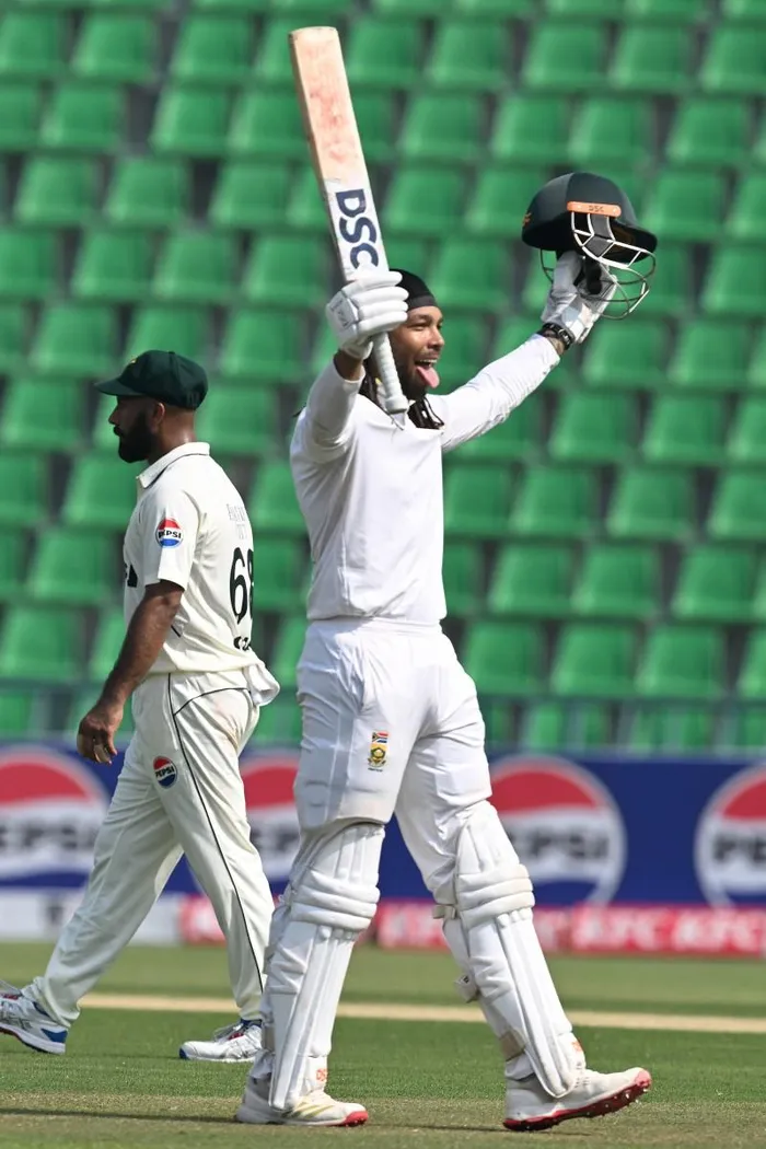 Proteas top-order batter Tony de Zorzi celebrates his second Test century. Picture: AFP