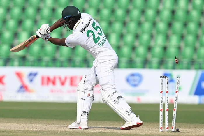 CASTLED: Last-man Kagiso Rabada is clean bowled as the Proteas lost the first Test to Pakistan by 93 runs. Picture: AFP