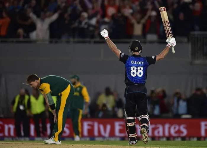 Daniel Vettori squeaked out a boundary second ball before returning the strike to Elliot. The former St Stithians pupil proceeded to break the hearts of his birth country but sent his adopted nation into a state of delirium when he smashed Steyn back over his head for six.
