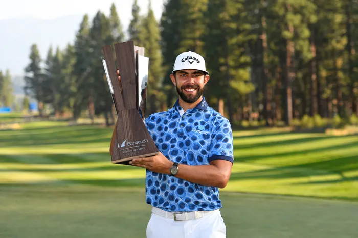 Erik van Rooyen of South Africa celebrates with the trophy after winning during the final round of the Barracuda Championship at Tahoe Mountain Club's Old Greenwood Golf Course on Sunday Erik van Rooyen of South Africa celebrates with the trophy after winning during the final round of the Barracuda Championship at Tahoe Mountain Club's Old Greenwood Golf Course on Sunday. Photo: Alex Goodlett/Getty Images/AFP