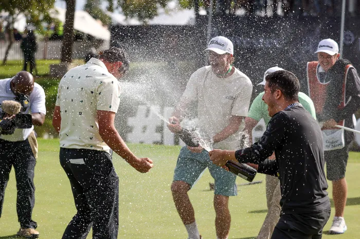 South African Casey Jarvis celebrates after winning the SA Open for the first time on Sunday afternoon in Stellenbosch. Photo: Sunshine Tour