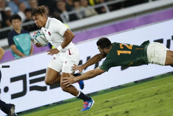 South Africa's centre Damian De Allende (R) tackles England's wing Anthony Watson during the Japan 2019 Rugby World Cup final match between England and South Africa at the International Stadium Yokohama in Yokohama on November 2, 2019. Picture: Odd Andersen / AFP
