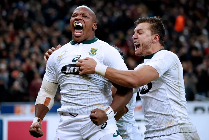 FILE - Bongi Mbonambi screams in delight after scoring the winning try for the Springboks against France. Photo: Yoan Valat/EPA