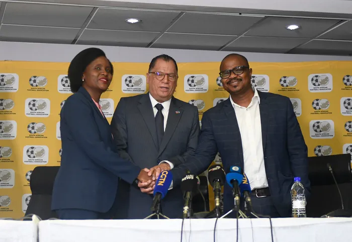 New Safa chief executive Lydia Monyepao, Safa president Danny Jordaan and outgoing Safa CEO Tebogo Motlanthe during a press conference at Safa House on Monday. New Safa chief executive Lydia Monyepao, Safa president Danny Jordaan and outgoing Safa CEO Tebogo Motlanthe during a press conference at Safa House on Monday. Picture: Sydney Mahlangu BackpagePix