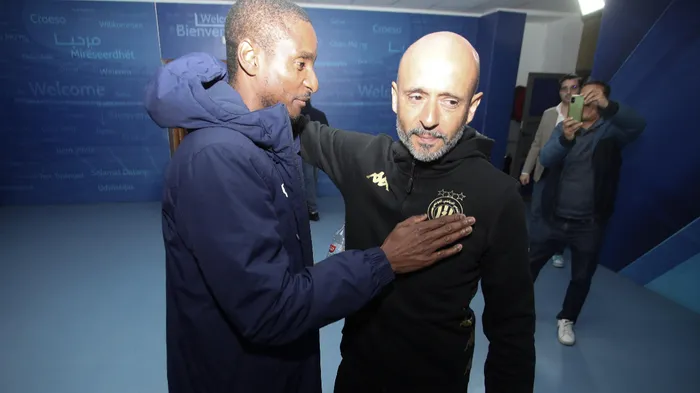 MIGUEL Cardoso during his time at ES Tunis is seen here getting cordial with his predecessor in the Mamelodi Sundowns job as they meet again in the Caf Chmpions League.