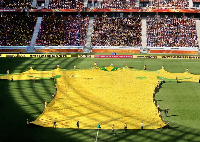 Giant Bafana Bafana Jersey -which was unveiled at the Cape Town Stadium today as the final stage of the Unite Mzansi Unite campaign that adidas ran for seven months -collecting signatures from South Africans of all backgrounds. 080710 Picture: Handout/Supplied Giant Bafana Bafana Adidas Jersey -which was unveiled at the Cape Town Stadium ahead of the 2010 Fifa World Cup as the final stage of the Unite Mzansi Unite campaign that adidas ran for seven months -collecting signatures from South Africans of all backgrounds. Adidas was again in Friday unveiled by Safa as the new kit sponsor for the next three years. | File