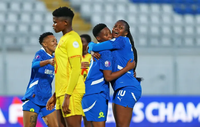 Melinda Kgadiete of Mamelodi Sundowns Ladies, centre, celebrates goal with teammate Boitumelo Rabale, Valentina Chinagorom Uroko of Edo Queens dejected during the 2024 CAF Womens Champions League match as the Brazilians continue to dominate football locally and continentally. | BackpagePix
