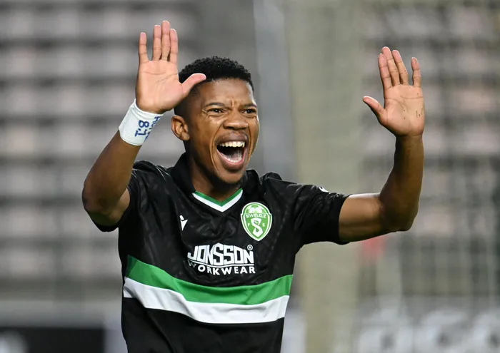 Teboho Potsane of Siwelele FC runs to celebrate his goal during the Betway Premiership clash against Stellenbosch FC at Athlone Stadium. Picture: Ryan Wilkisky/BackpagePix