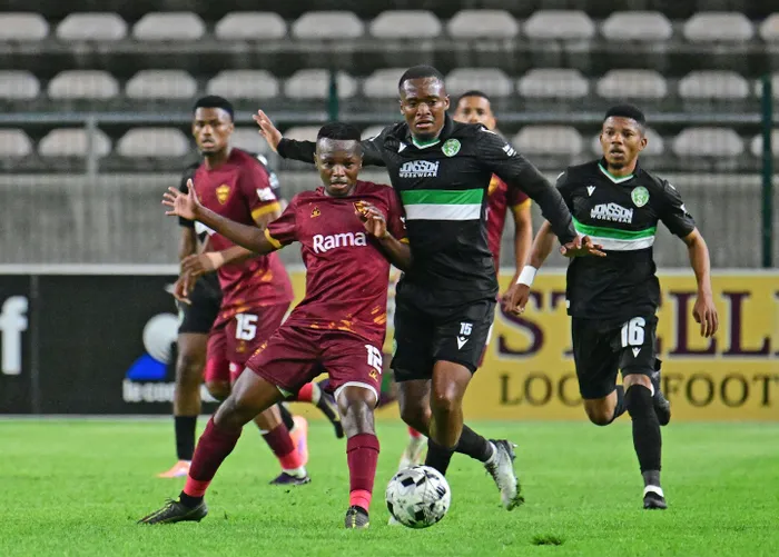 Thato Khiba of Stellenbosch FC is challenged by Relebogile Mokhuoane of Siwelele FC during the Betway Premiership match at Athlone Stadium on Wednesday. | BackpagePix